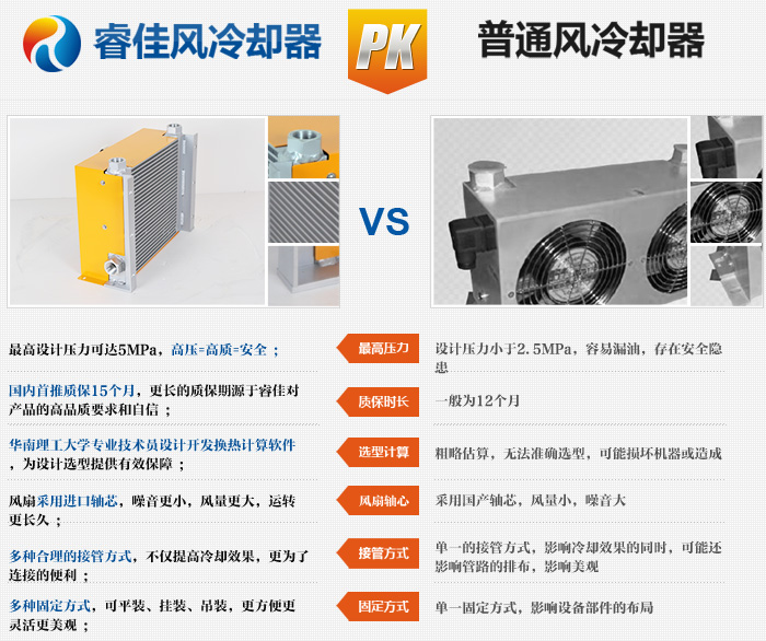 答:市面上風冷卻器的接口大多數(shù)是兩個接口,安裝方式單一,且不方便。睿佳冷卻器廠家的標準產(chǎn)品設計獨特,有三個油口,可以任意連接其中兩個??善窖b、掛裝、吊裝,更方便更靈活。